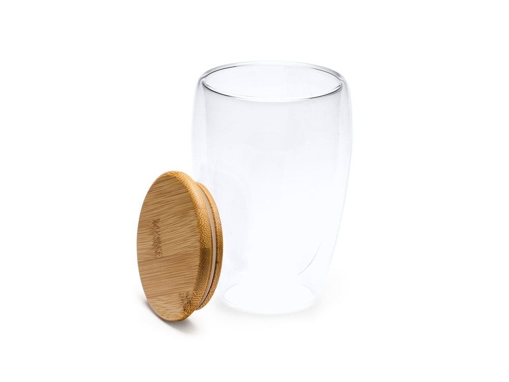 Двустенный стакан из боросиликатного стекла с бамбуковой крышкой. Идеально подходит для подарков для ваших клиентов. Емкость 350 мл.