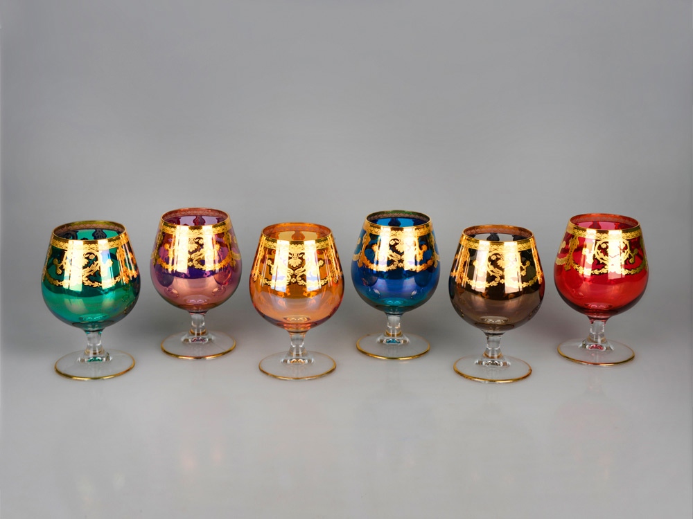 Отличный набор бокалов для вина станет ярким украшением праздничного стола. Бокалы выполнены из разноцветного стекла сочных оттенков и задекорированы золотистым орнаментом. В комплекте прилагается подарочная упаковка.
