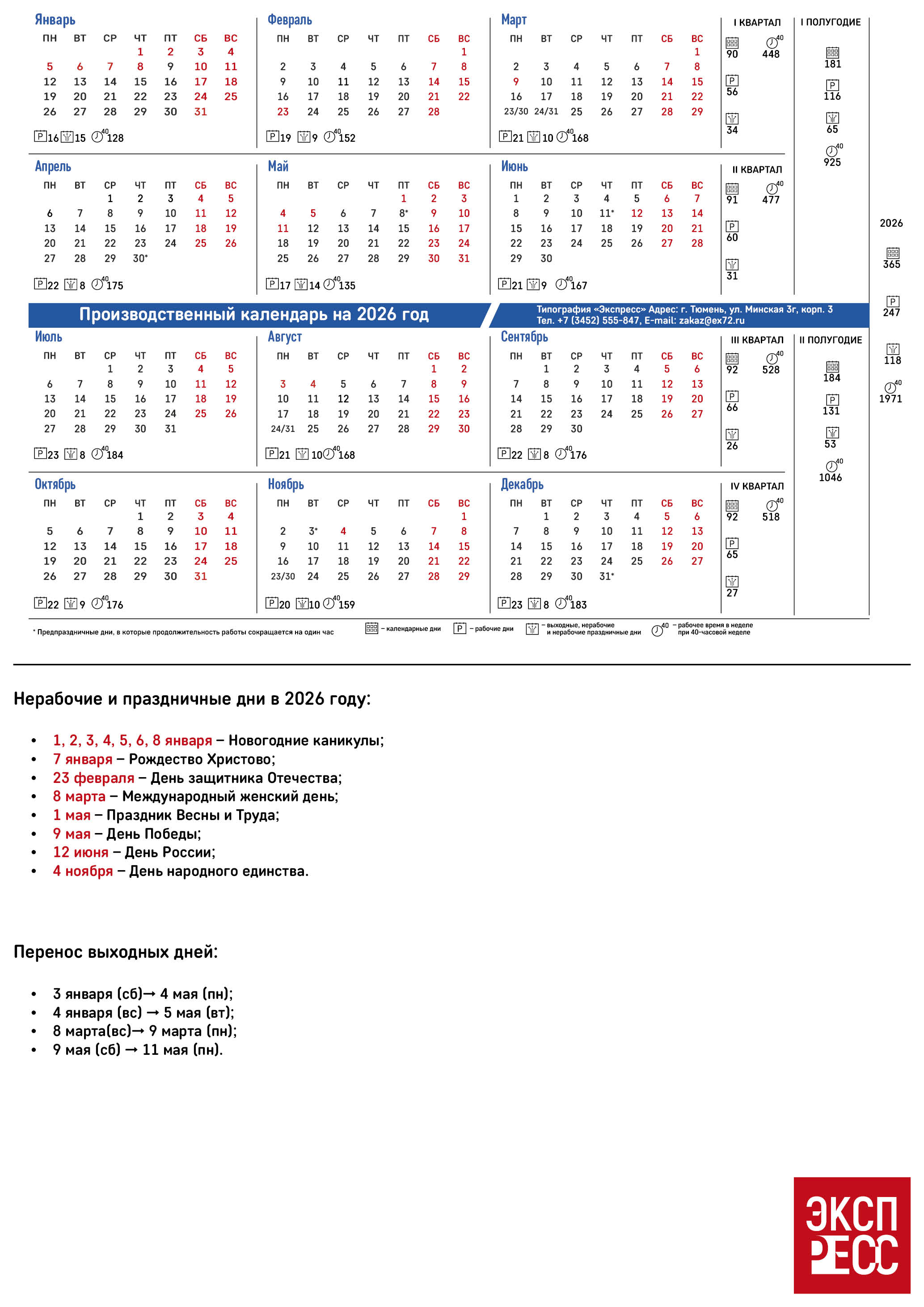 Производственный календарь на 2025 или 2026 год с выходными и праздничными днями является важным рабочим материалом российских кадровиков и бухгалтеров.